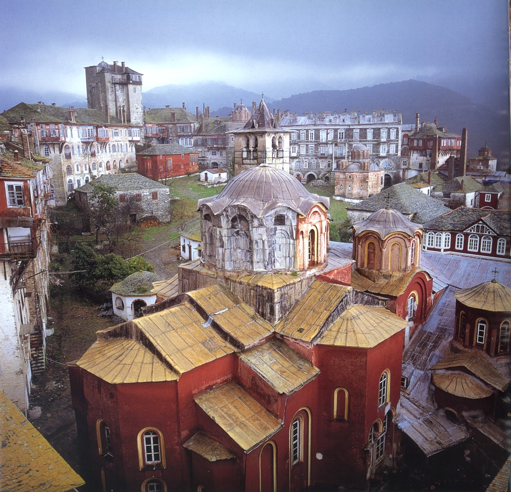 Η δυτική πλευρά της Μονής από τον πύργο του Αγίου Γεωργίου (ή «τού Αγίου Ονουφρίου”) μέχρι τον πύργο της Μεταμορφώσεως. Διακρίνεται το παλαιό οχυρό συγκρότημα της εισόδου της Μονής και το νεώτερο προστώο της