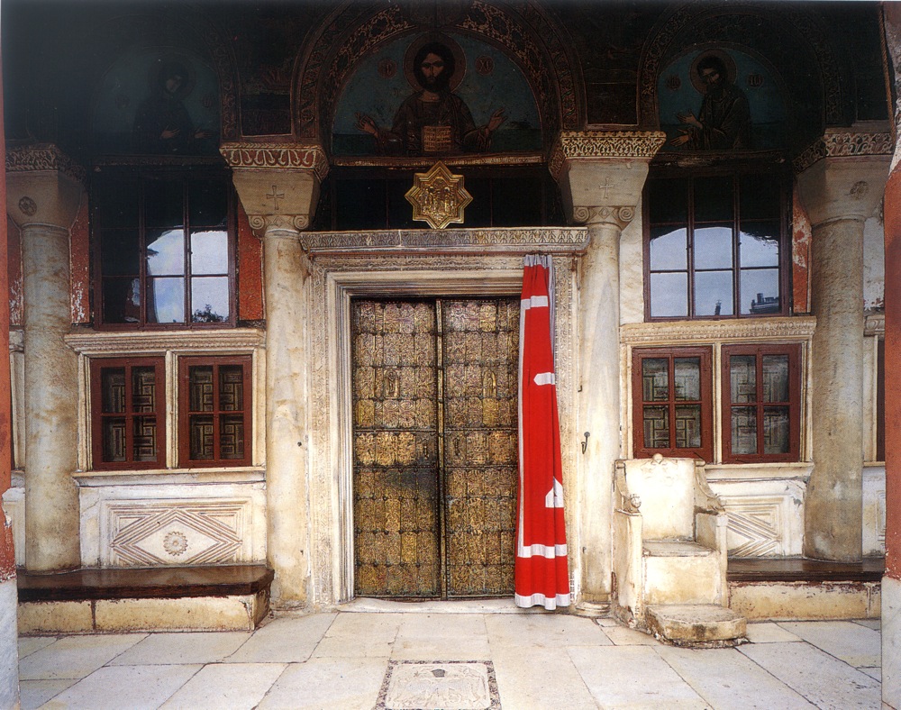 Μερική άποψη του πενταβήλου της λιτής. Διακρίνεται η κυρία είσοδος του καθολικού με την χαλκεπένδυτη θύρα, τη λεγόμενη «χυτή»