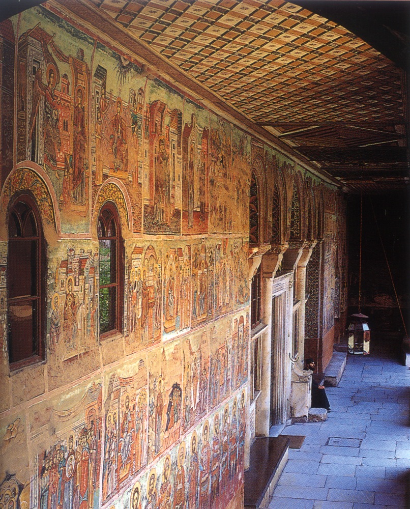 Αποψη του εσωτερικού εξωνάρθηκα. Αριστερά η τοιχογραφία των εικοσιτεσσάρων στάσεων του Ακαθίστου