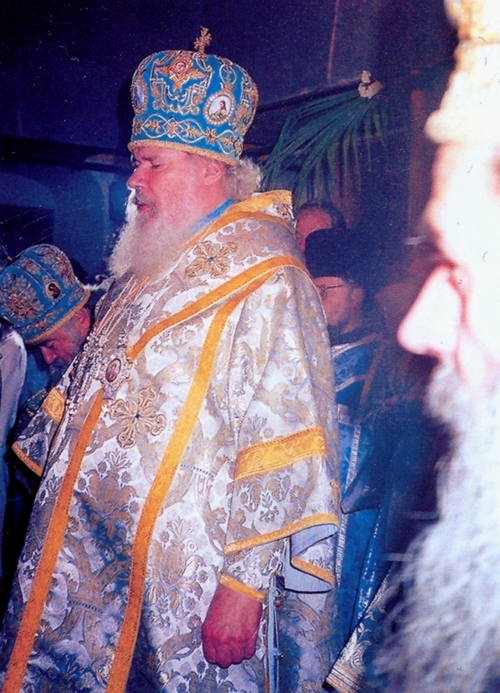 Ο Πατριάρχης της Ρωσσίας κ.κ. Αλέξιος κατά την επίσημη λειτουργία και τη τελετή επιδόσεως των ιερών λειψάνων του Αγίου Μαξίμου του Γραικού. Δεξιά της φωτογραφίας διακρίνεται φωτισμένο το προφίλ του Μητροπολίτου Άρτης Ιγνατίου Δ΄.