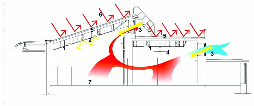 ΕΓΚΑΡΣΙΑ ΤΟΜΗ 1. Ηχοαπορροφητική ψευδοροφή (ίνες ανακυκλωμένου υάλου). 2. Ανακλαστική μεταλλική ψευδοροφή. 3. Ανοιγόμενο παράθυρο με εξωτερικές περσίδες σκίασης. 4. Ανεμιστήρες οροφής. 5. Εξωτερική θερμομόνωση (φυσαλίδες υαλόμαζας). 6. Επένδυση με χαλκό. 7. Μαρμάρινο δάπεδο.