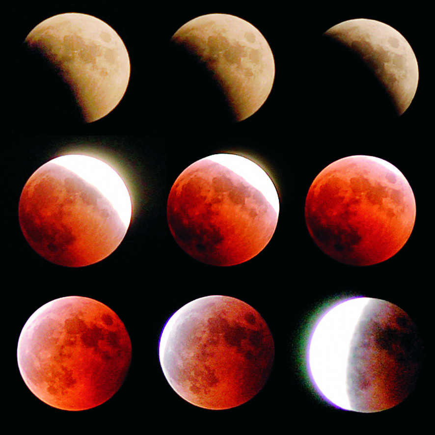 Κατά τη διάρκεια της έκκλειψης, η σελήνη παίρνει ένα σκούρο κοκκινωπό χρώμα επειδή φωτίζεται από τις ακτίνες του ηλίου που παιρνούν μέσα από την ατμόσφαιρα της γης. Οι μπλε συνιστώσες του φωτός διαχέονται (αυτός άλλωστε είναι και ο λόγος που ο ουρανός είναι γαλάζιος)