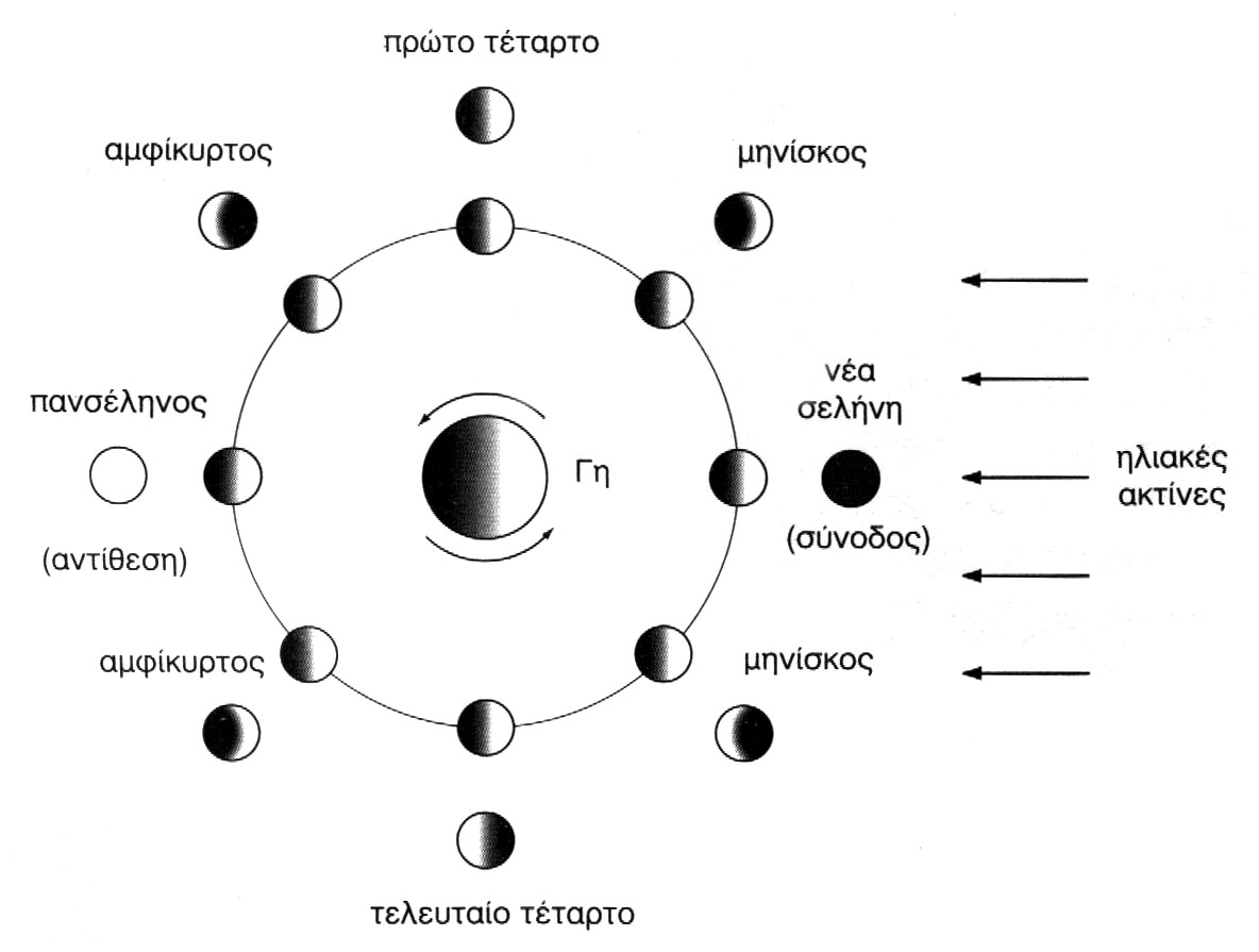Φάσεις της Σελήνης. Η σεληνιακή έκκλειψη λαμβάνει χώρα όταν η Σελήνη βρίσκεται στη φάση της πανσελήνου (αντίθεση), ενώ η ηλιακή έκκλειψη συμβαίνει όταν η Σελήνη βρίσκεται στη φάση της νέας Σελήνης (νουμηνία).