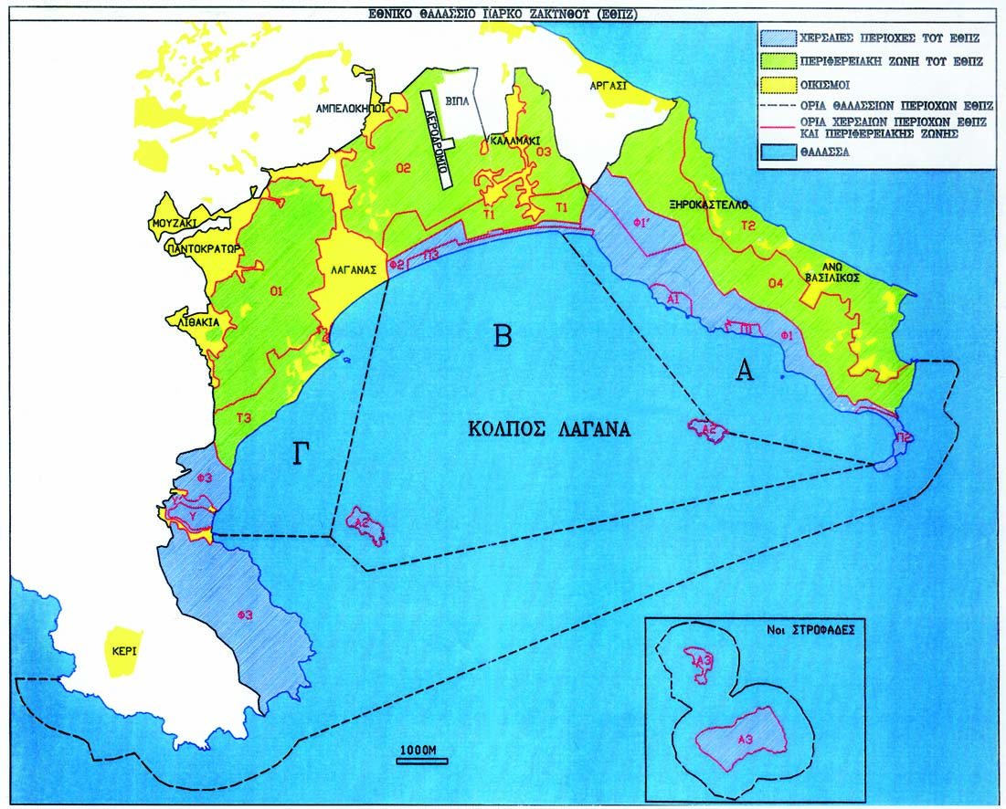 Χάρτης με τις ζώνες του Εθνικού Θαλάσσιου Πάρκου Ζακύνθου στον κόλπο του Λαγανά, που προστατεύει τους βιότοπους αναπαραγωγής της θαλάσσιας χελώνας.