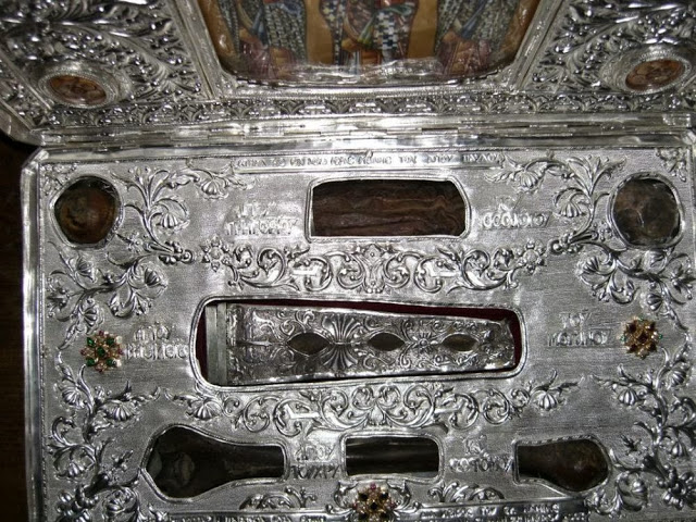 Părticele din Cinstitele Daruri ale Magilor, parte din cinstitul cap al Sfintei Marii Mucenițe Fevronia și din moaștele Sfântului Mihail, episcopul Synadelor