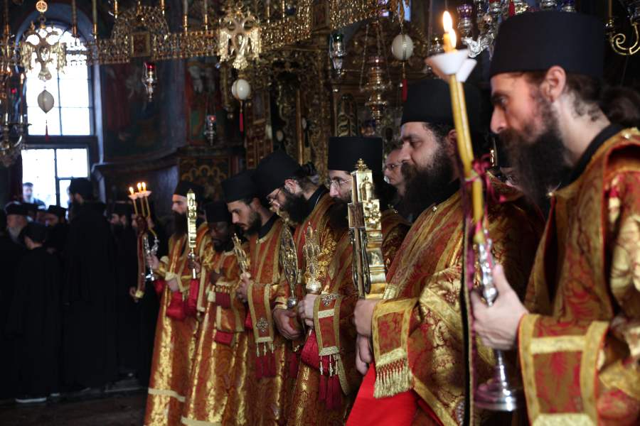 Au luat parte la slujbă egumenul Mănăstirii Vatopedi, Gheronda Efrem, egumenul Mănăstirii Sfântului Dionisie din Olimp, arhim. Maxim Kyrítsis şi o mulţime de preoţi din multe sfinte mănăstiri şi schituri ale Sfântului Munte.