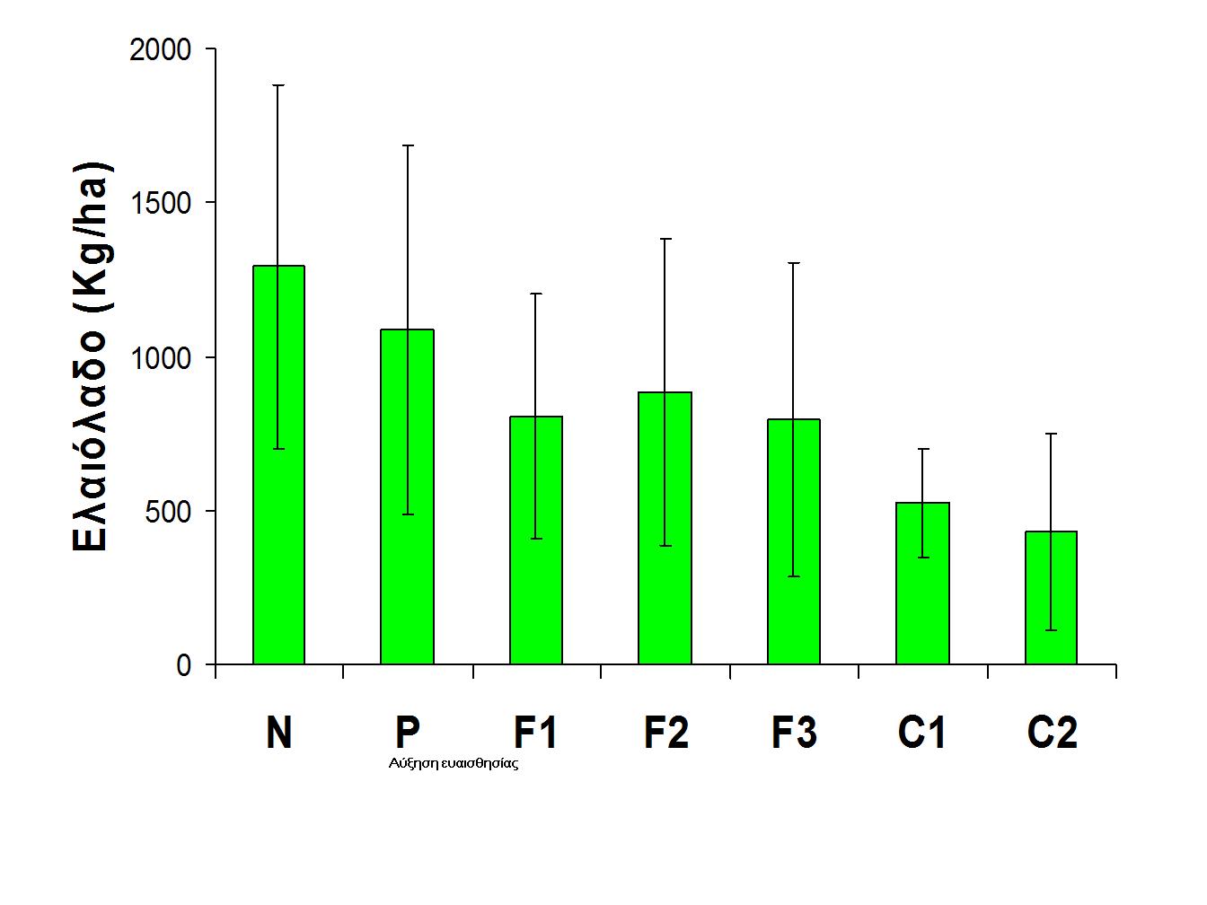 Μεταβολή της μέσης παραγωγής ελαιολάδου με τον βαθμό ευαισθησίας της γης στην ερημοποίηση.