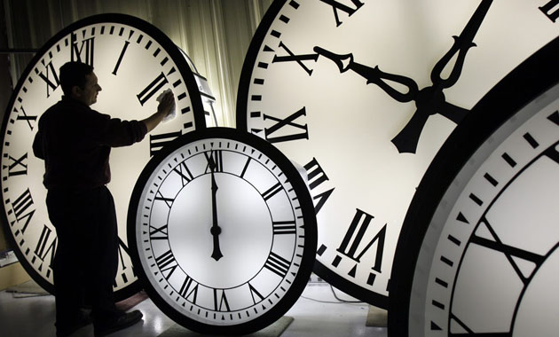 Electric Time Co. employee Walter Rodriguez cleans the face of an 84-inch Wegman clock at the plant in Medfield, Mass. Thursday, Oct. 30, 2008. Daylight savings time ends early Sunday morning with clocks turned back one hour. (AP Photo/Elise Amendola)