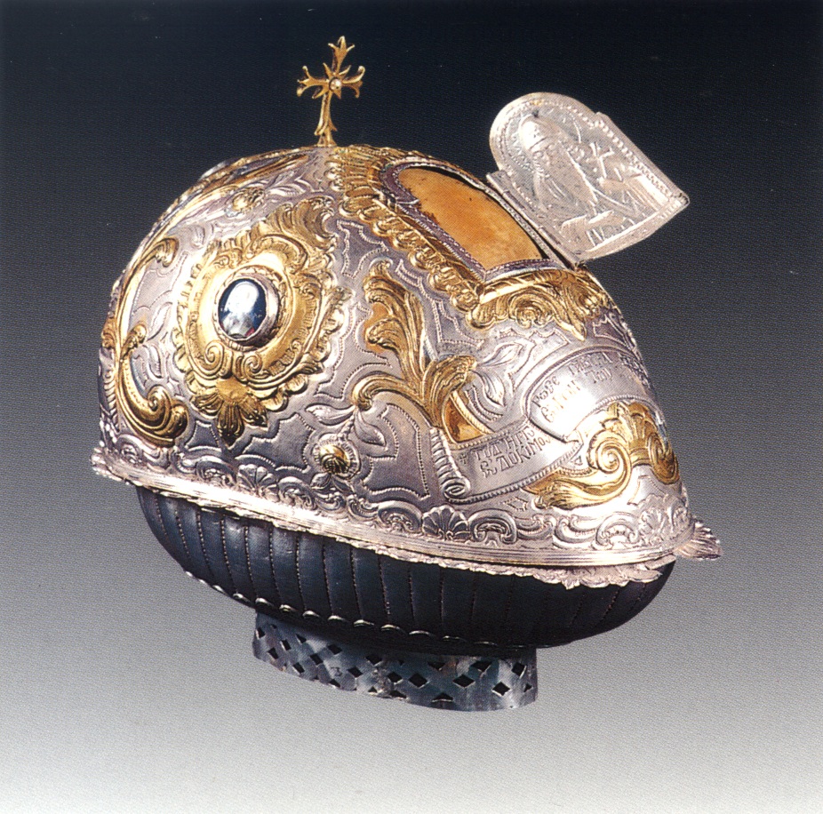 Η λειψανοθήκη με την κάρα του αγίου Ευδοκίμου του νεοφανούς. «Δι’ εξόδων και δαπάνης Γαβριήλ μοναχού Ναουσαίου και Ιατρού Βατοπαιδινού. 1842 Ιανουαρίου 10»