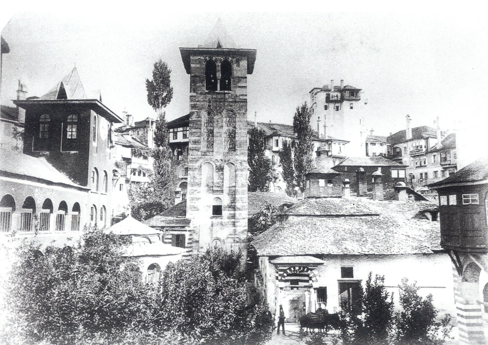 Φωτογραφία των κτηρίων νοτίως της αυλής του καθολικού. Το κτήριο δεξιά του κωδωνοστασίου είναι το παλαιό μαγειρείο, που κατεδαφίστηκε το 1894 (Riley 1883)