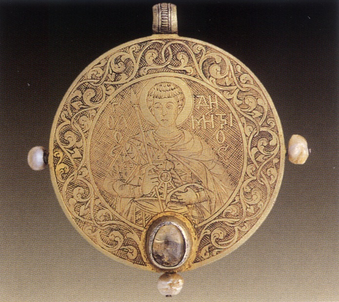 Αμφιπρόσωπο επιχρυσωμένο εγκόλπιο με παραστάσεις του Χριστού Παντοκράτορος και του Αγίου Δημητρίου, β’ μισό 14ου αιώνα