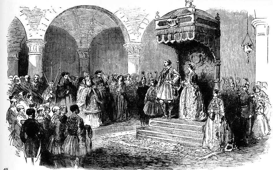 Χαρακτικό από τον ξένο τύπο της εποχής με φανταστική αναπαράσταση του Όθωνα και της συνοδείας του, στον Μητροπολιτικό Ναό των Αθηνών.