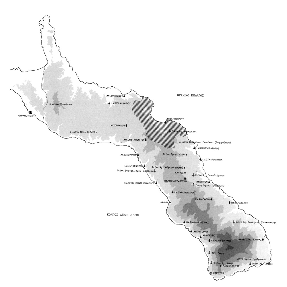 Χάρτης του Αγίου Ορους, όπου διακρίνεται η περιοχή της Μονής Βατοπαιδίου